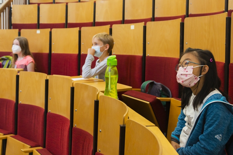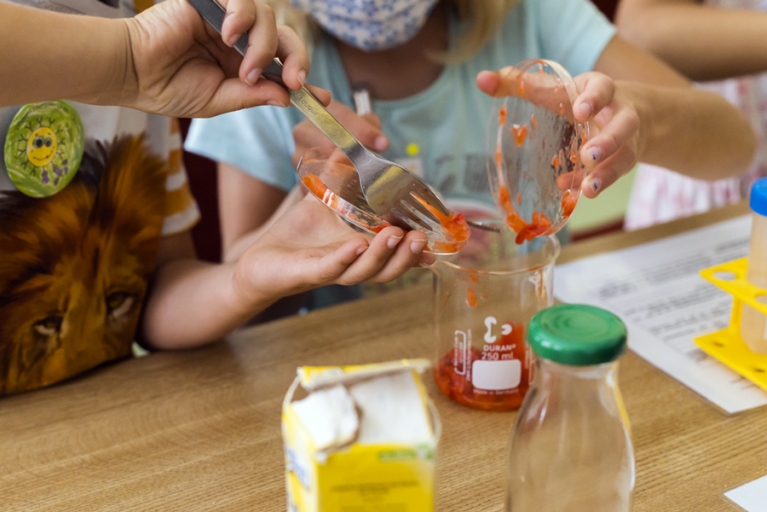 After an involuntary break in 2020 we could again welcome little scientists on the 29th of July and 5th of August. Within the framework of the campus holidays for kids of the family office of the OVGU they visited us, to discover the world of immune cells. PhD students of the MGK 854, students of the M.Sc. Immunology and staff members of CRC 854 gave them insights into the immune system. During an interactive lecture the children learned what this mysterious immune system actually is and how our body police protects us from intruders. Numerous questions and enthusiastic participation showed that the children had already heard many of the key words due to the pandemic but making sense of them is actually not so easy. Afterwards the litte discoverers could get gloves on and isolate DNA from strawberries - every succesful isolation was excitedly greeted. Furthermore the children could make immune cell buttons and take them home afterwards and everyone got a copy of "Immun im Cartoon", a comic for further reading at home. Thank you very much to the dsai e.V. (Patientenorganisation for angeborene Immundefekte) for providing these free of charge!